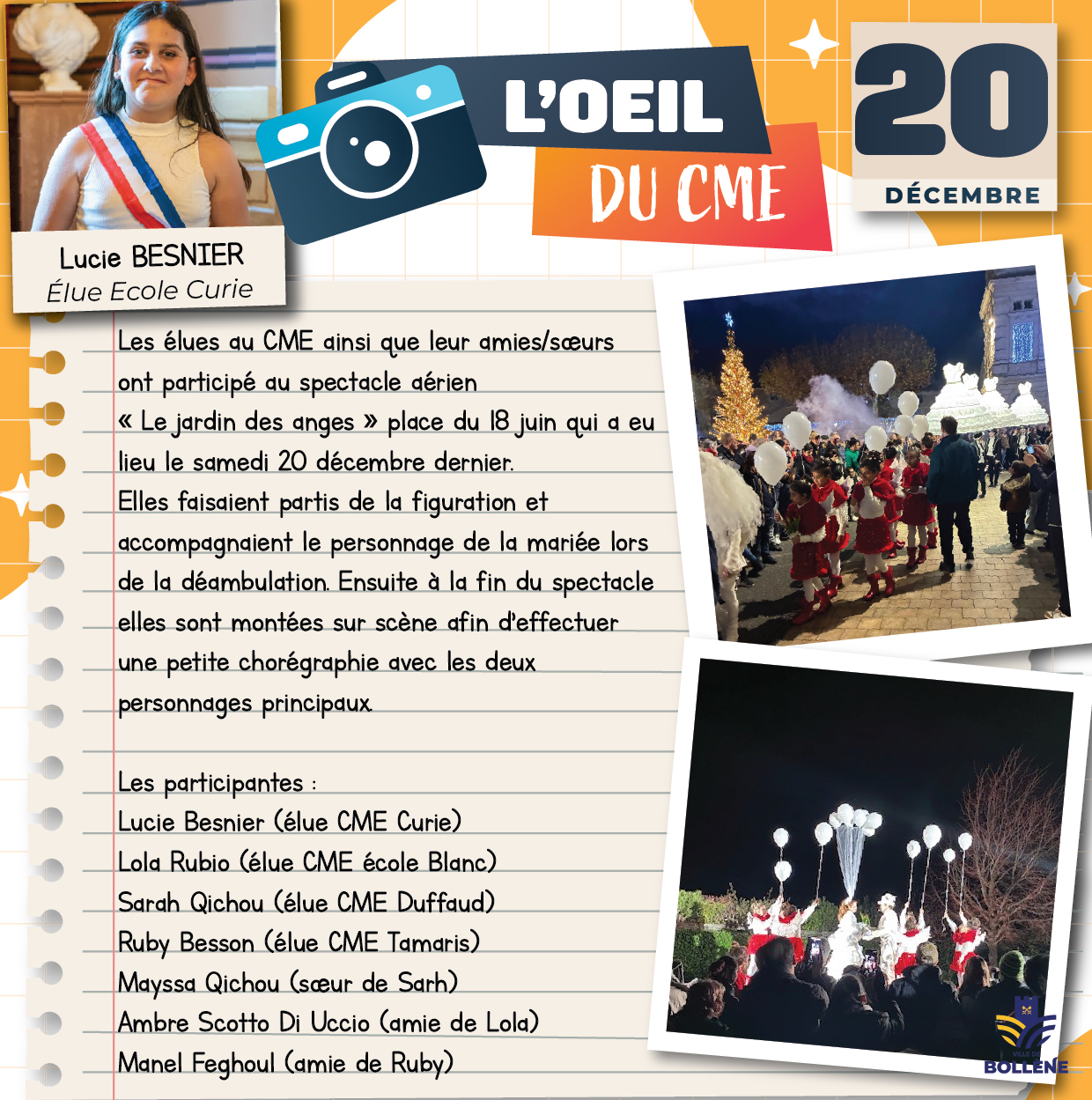 Les élus du Conseil Municipal des Enfants racontent leurs aventures et les événements auxquels ils participent à travers leurs articles, publiés sous le nom « L’œil du CME », une initiative entièrement imaginée et portée par ces jeunes élus.