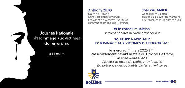 La Ville de Bollène vous invite à la Commémoration du 11 mars, Journée Nationale d'Hommage aux victimes du terrorisme, le mercredi 11 mars.