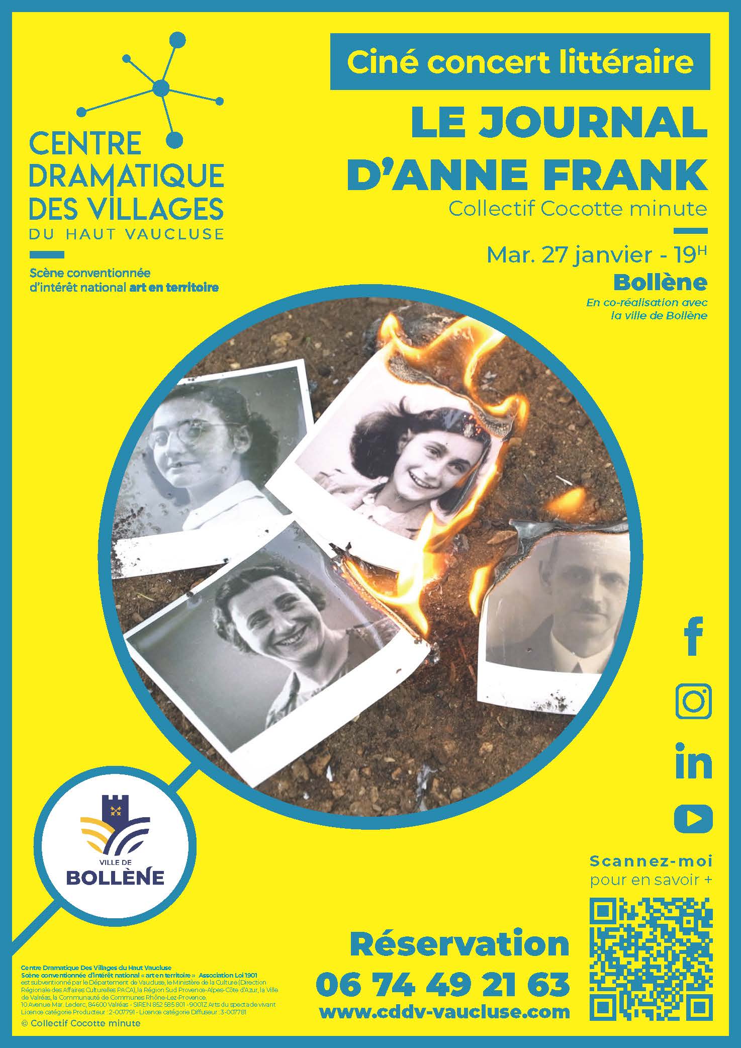 Le Centre Dramatique Des Villages du Haut Vaucluse (CDDV), en co-réalisation avec la ville de Bollène et l’intercommunalité, présente Le Journal d’Anne Frank, une création du collectif Cocotte minute.