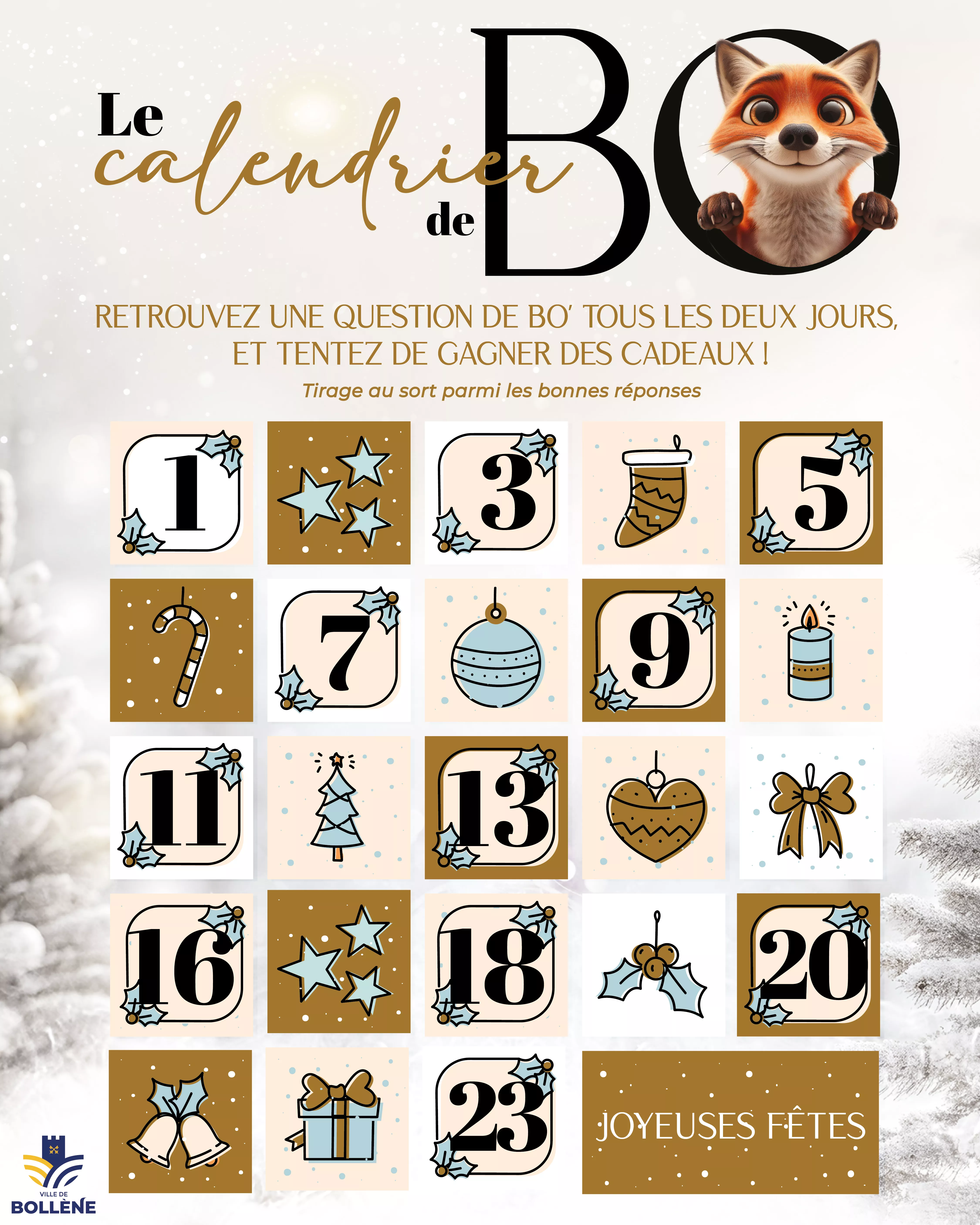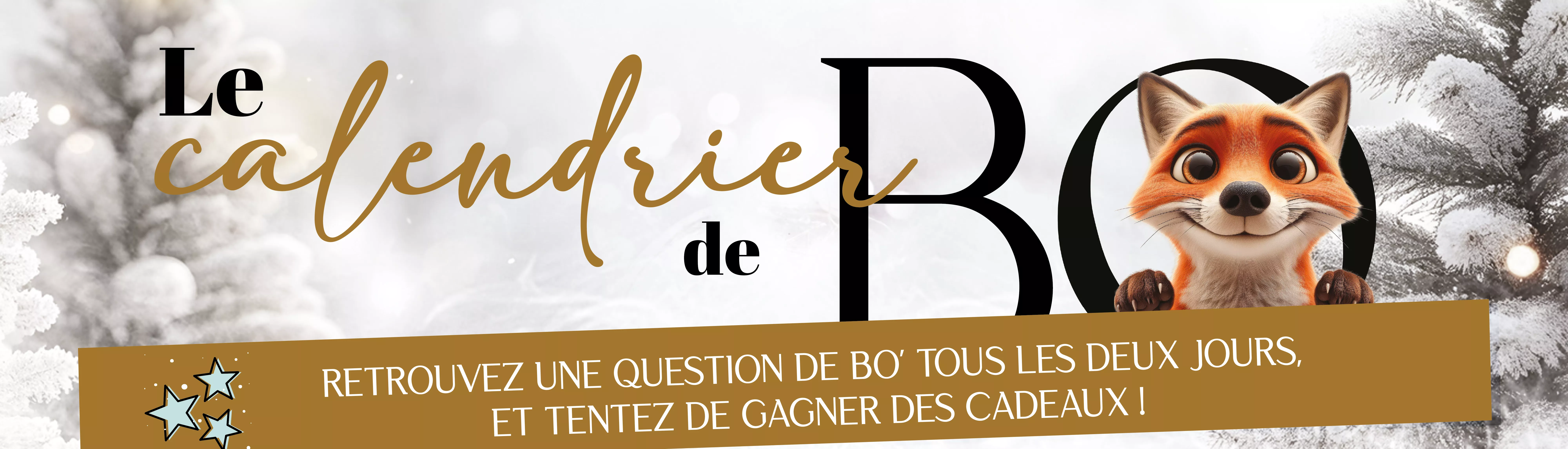 Participez au jeu de Noël Le calendrier de BO' en répondant au défi du jour et tentez de remporter des cadeaux ! Un tirage au sort sera effectué pour chaque jeu. Le gagnant sera annoncé sur les réseaux et sera contacté par mail. Bonne chance à toutes et à tous !
